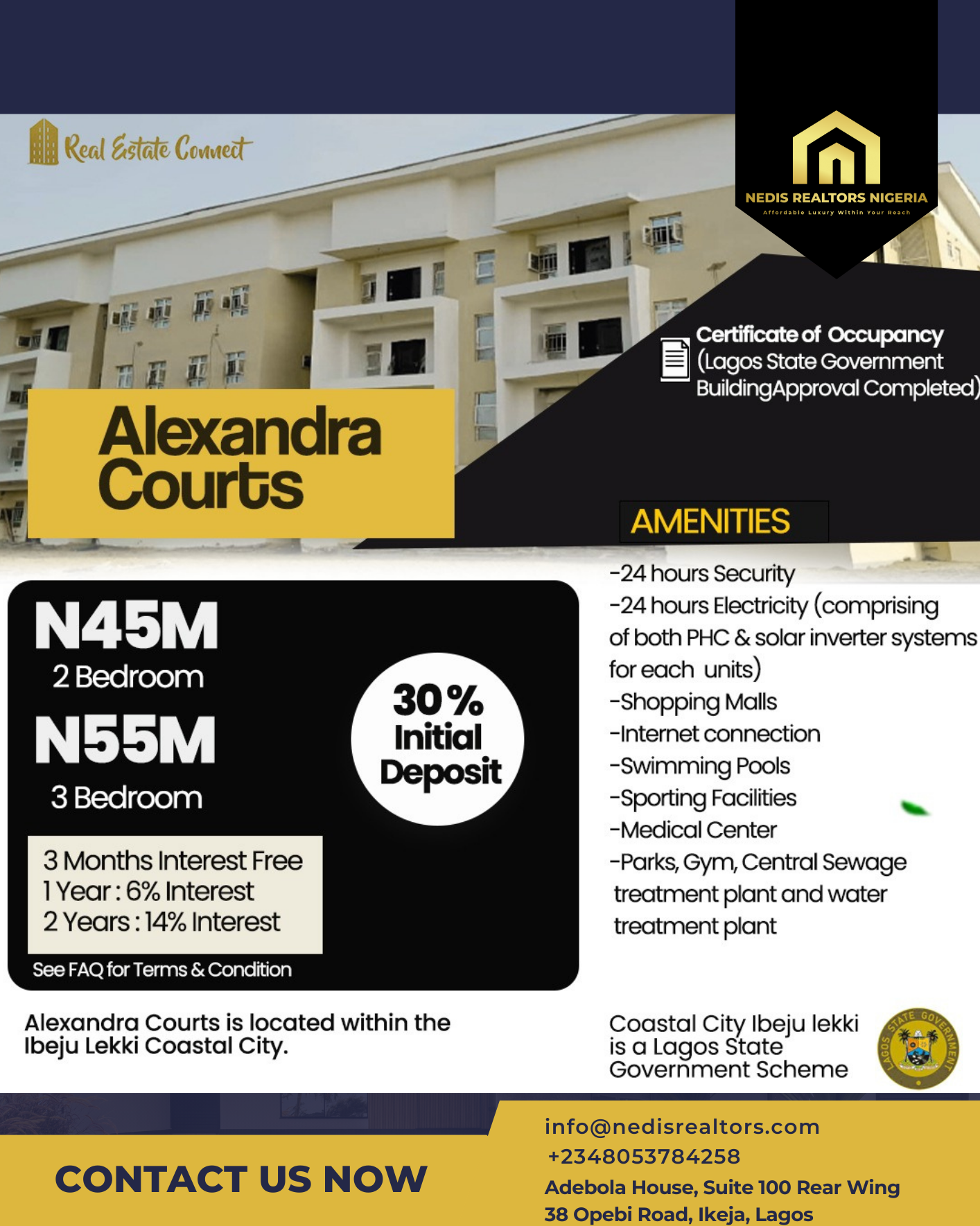 Nestled amidst prestigious neighbors including the New Deep Seaport, The Lagos Free Trade Zone, Gracias Morganite, and Amen Estate, Alexandra Courts is just a 15-minute drive from the New Lekki International Airport.